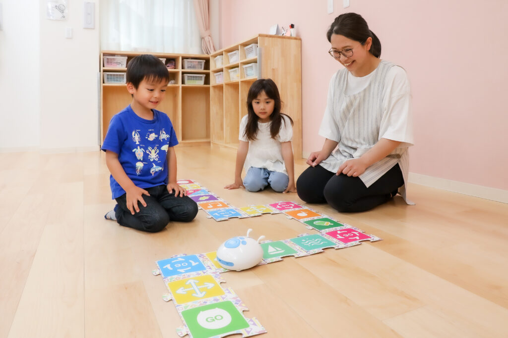 2歳児~年長クラスの園児を対象にプログラミング教育を実施しています。専用のロボットを使いながら、お友達と楽しく、順序立てて考える力を遊びながら身に付けます。