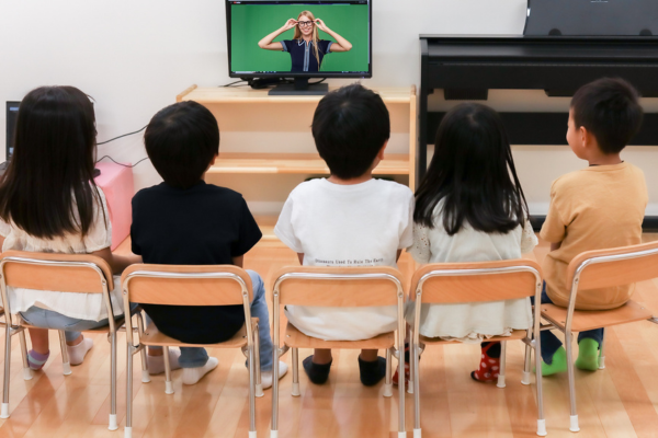 インターネットを通じて ネイティブ講師が進めていく、歌やダンスが中心のオンライン学習です。子どもたちはもちろん、先生方も一緒に楽しくレッスンを受講しています♬